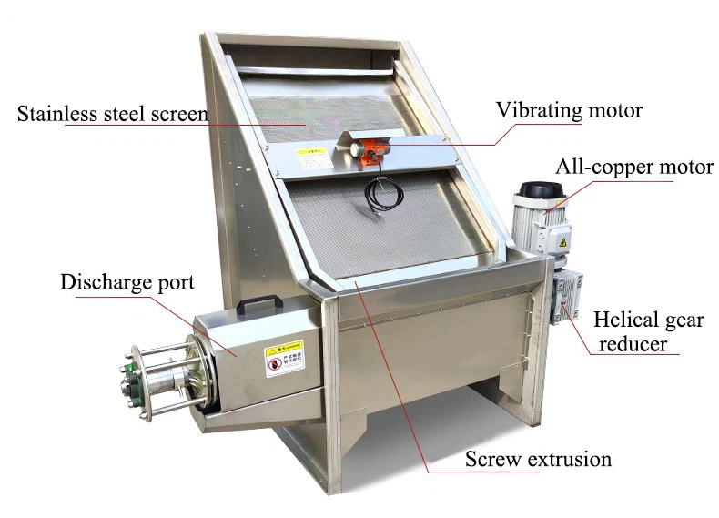 It primarily consists of a spiral auger, a cylindrical filter, an inclined screen, a reduction motor, and a vibrating motor. Some units are also equipped with an electronic control system and a cutting pump to enable automated operation and material conveying.